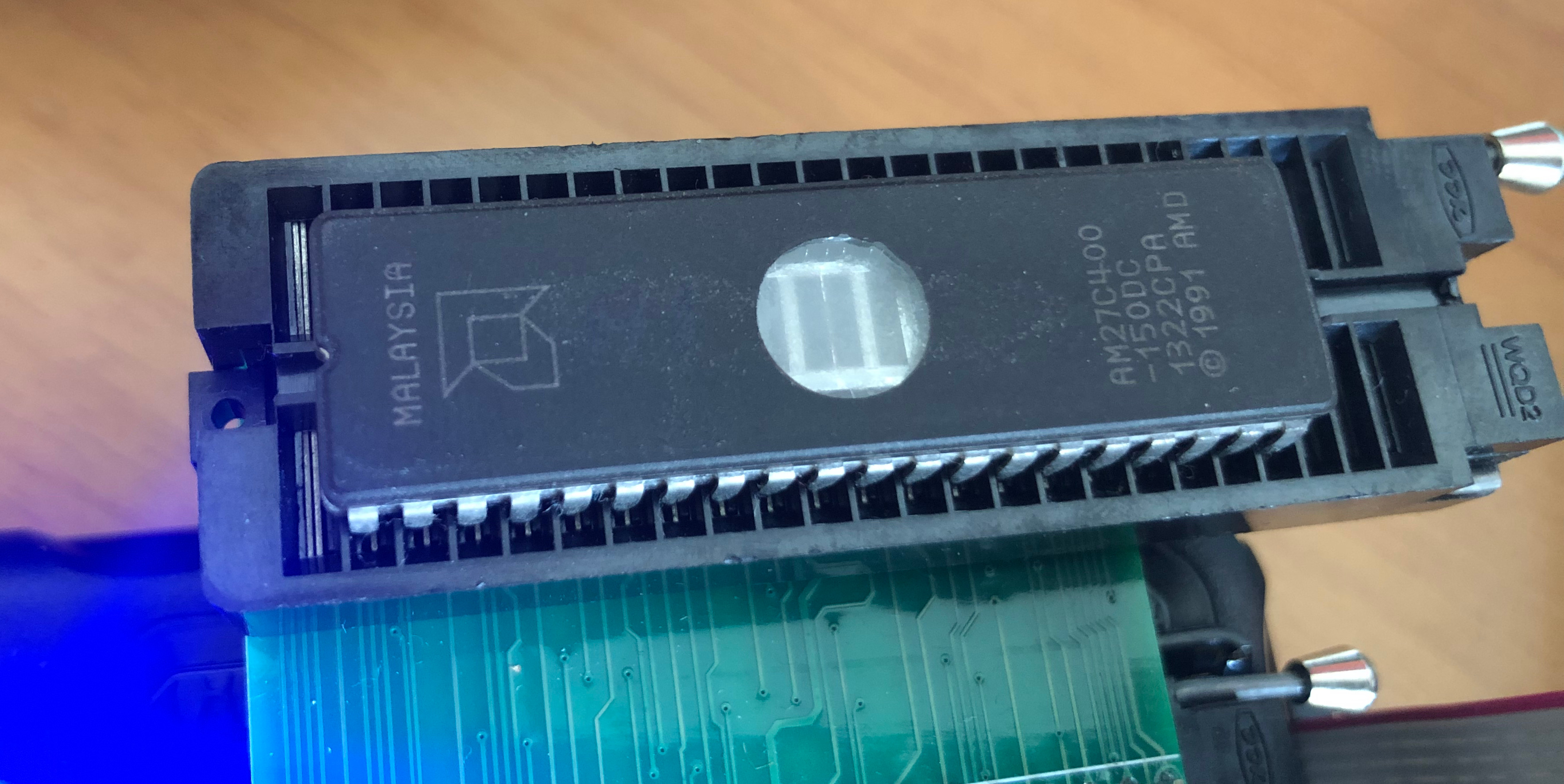 Le AM27C400 vanno prima cancellate mettendole dentro il cassetto dell'UV Eraser, servono circa 10-20 minuti per cancellarle, quindi impostare il timer su 2 (20 minuti per stare tranquilli), mettere le 2 EPROM nel casetto, chiudere il cassetto e accendere.
